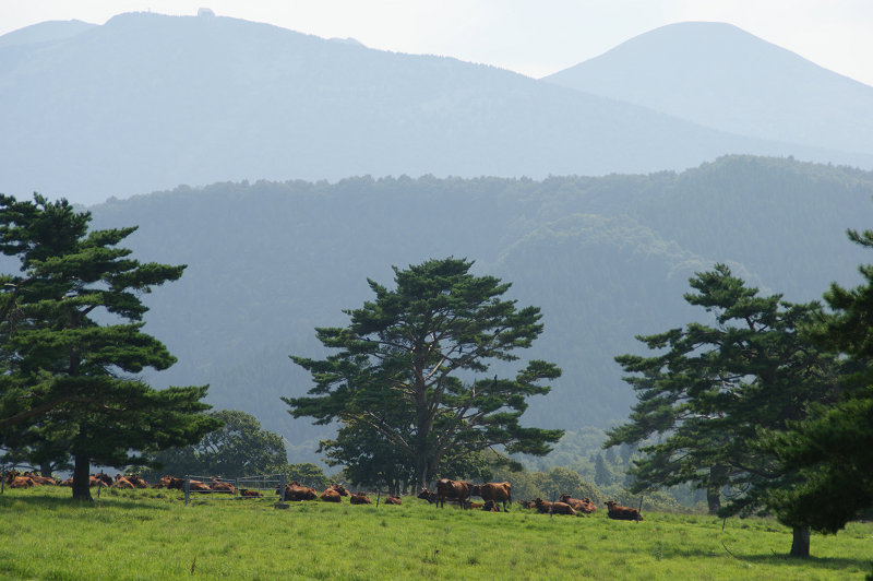 八甲田牧場。黒毛和牛に対して「あかべこ」と呼ばれる日本短角牛がくつろいでいた。