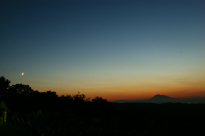 雲谷の岩木山展望所から見た岩木山。午後5時55分頃。左に三日月が見えている。