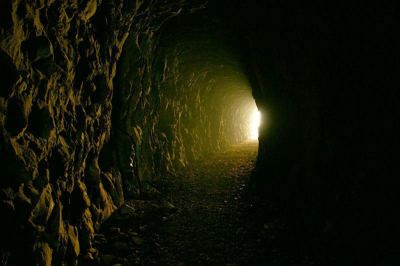 森林鉄道のトンネルをくぐる遊歩道。曲がっているので最初は先が見えず、薄気味悪い。