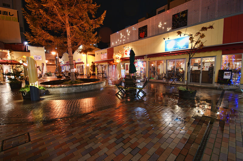 灯りでパサージュ広場の小さなお店が暖かく見える。