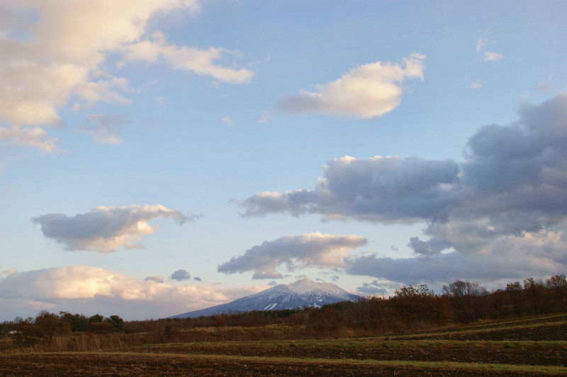 うっすらと雪化粧した岩木山が雲の下で柔らかな陽光に浮かんでいた。