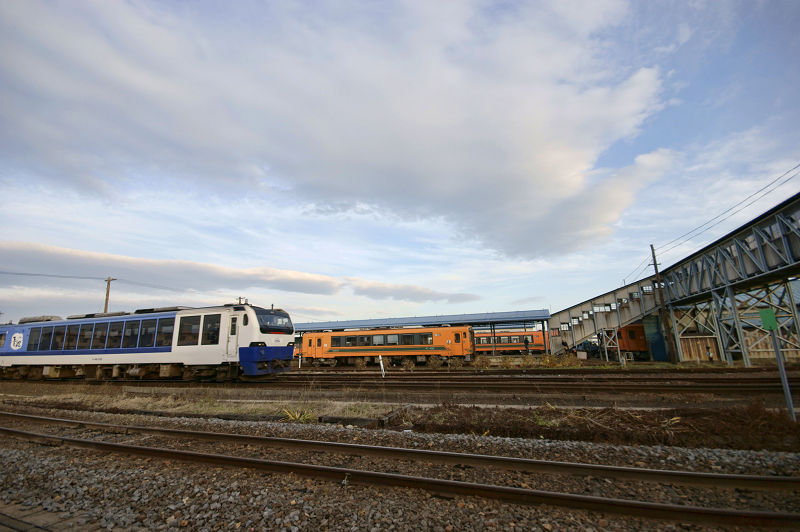 JR五能線のリゾートしらかみ号。津軽鉄道の走れメロス号の横を通って五所川原駅に入ってくる。
