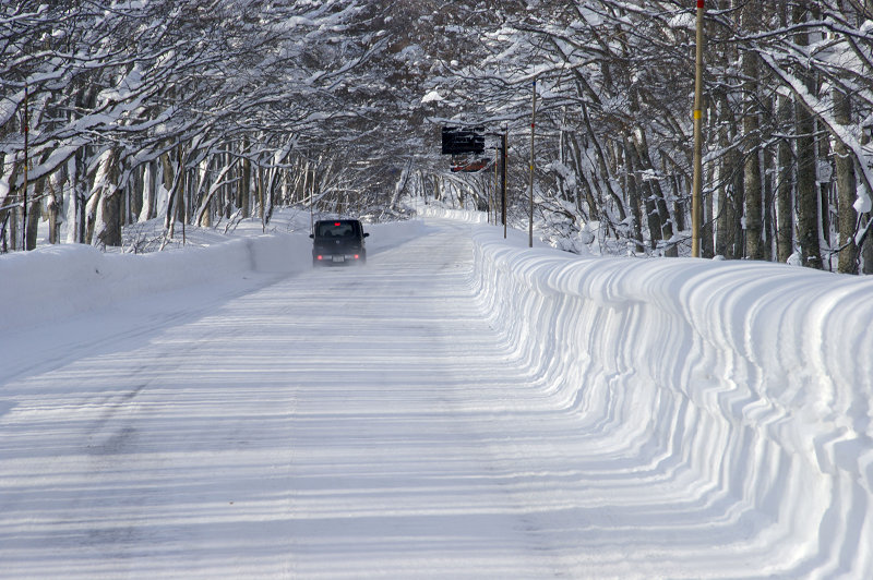 国道103号。縞模様を作るブナの影。火箱沢林道分岐辺りは急勾配が続く。下っていくクルマはブレーキランプが点っている。