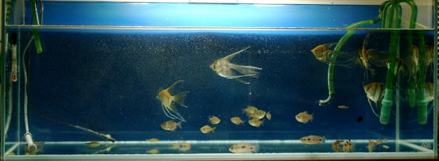 | ■クリプトコリネが黒ヒゲ藻だらけになる状態に、とうとう、堪忍袋の緒が切れました。 大磯砂を取り去って、魚しかいないベアタンクにしてしまいました。 「なかなか綺麗だね」とか言いながら眺めていますが、なんだか物足りません。 これは「水景」と呼んじゃぁいけませんね。 |