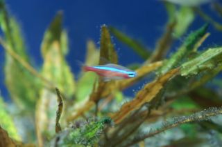 ■リセット前の様子 コケだらけのクリプトコリネの葉の間を泳ぐカージナルテトラ。 キレイじゃないので小さい写真にしておきます。 |