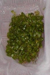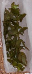■購入した水草■ 注文した水草は下の五種類です。 左から、「ルドウィジアオバリス(ミズユキノシタ)」「ウォーターバコパ」「マヤカ」「グロッソスティグマ」「ブリクサショートリーフ」です。 どれも、プリプリしてはち切れそうです。このまま定着して育ってくれればよいのですが・・・。 |