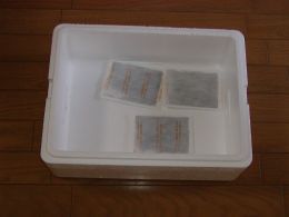 ■配達された水草■ 注文通り土曜日の午前中にヤマト運輸さんが水草を届けてくれました。発泡スチロールでメチャクチャ軽い箱一つでした。水草は下の写真のように丁寧に梱包されていました。箱の底の新聞紙には使い捨てカイロが3つも入っていました。 |
