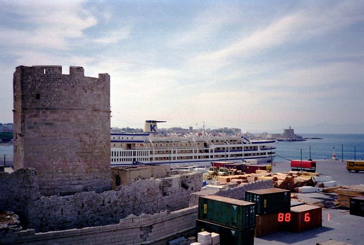 ■ロードス島の港。わずかに遺跡を避けてコンテナヤードが迫っていました。