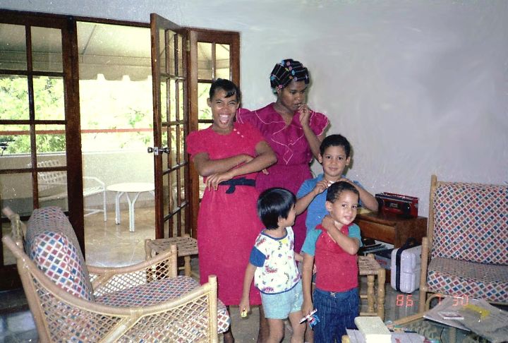 ■女中さんたちと近所の子どもたち。我が家では住み込みの女中さん1人(中央の娘)を雇っていました。