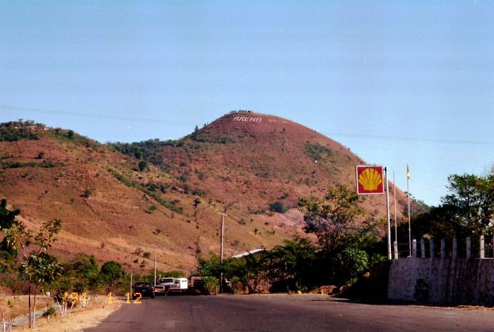 山の上に政党名「ARENA」の文字が書かれています。その右横には対抗政党「fmln」の文字が書かれているように見えます。