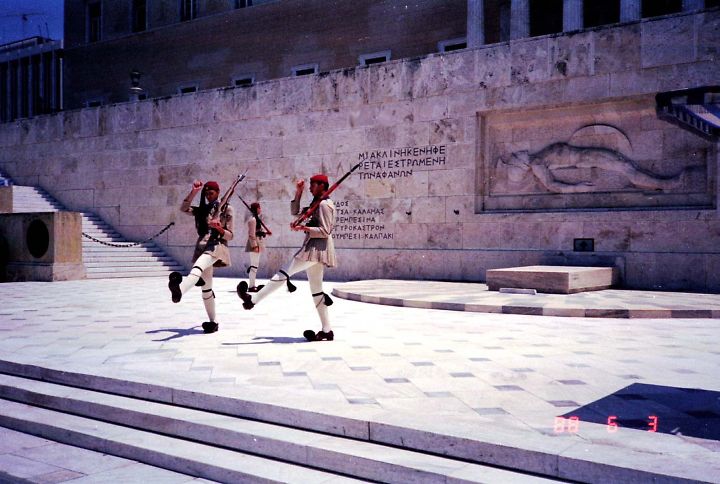 ■国会議事堂前の広場で鳩と戯れていると、突然、オモチャの兵隊さんに出くわしました。無名戦士の碑の前で衛兵の交代(の儀式)が始まりました。着ている衣装はエヴゾナスという民族衣装だそうです。
