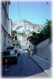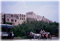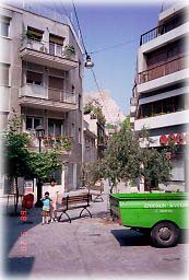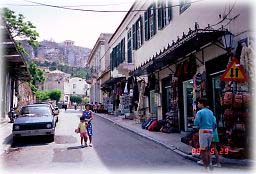 | ■アクロポリスの丘は至るところから見えました。旧市街地のプラカ地区の街路を見通すとアクロポリスの城壁のような壁やパルテノン宮殿が目に入ってきました。 |