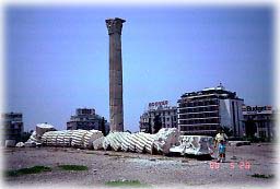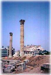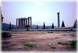| ■ゼウス神殿は、かつては104本もの柱が立ち並んでいたらしいのですが、今は15本の柱が立っていました。さすが、ギリシャ神話の最高神「ゼウス」の神殿だけあって、現在でも広々とした床が残されていました。横倒しになった大理石の柱を間近で見ることができ、その巨大さを実感できました。古代ギリシャの人々の奔放な精神の高揚の夢の跡といった感じで、遺された遺物としての遺跡とはこうあるべきといった趣に包まれます。 |