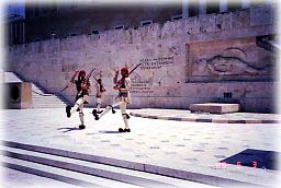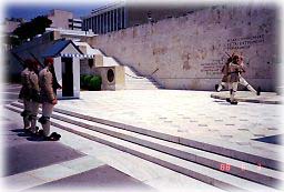 | ■国会議事堂前の広場で鳩と戯れていると、オモチャの兵隊さんのような格好をして歩いてくる衛兵に出くわしました。何も調べずに歩き回っていたので、国会議事堂前の壁面が無名戦士の碑とは気づきませんでした。ちょうど、碑を護る衛兵が交代する場面を見ることができました。着ている衣装はエヴゾナスという民族衣装だそうです。 |