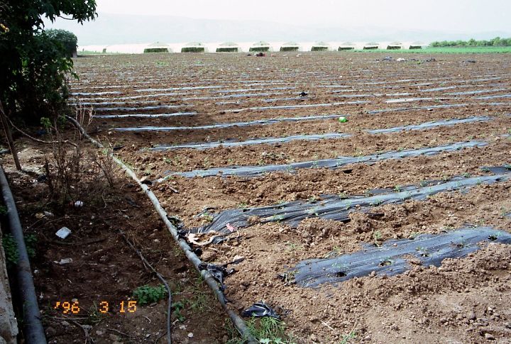 ■ヨルダン渓谷では水を節約する近代的な農業が行われていました。土壌蒸発を抑えるマルチと点滴かんがいをするホース。