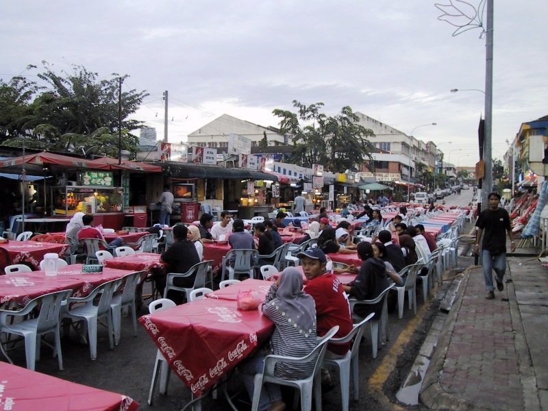 ■屋外に並べられた食事テーブルで人々が談笑していました。日没の合図を待っているのです。断食は日の出から日の入りまでの間は飲食できないのですが、逆に、日の入り後は飲食して良いということでした。