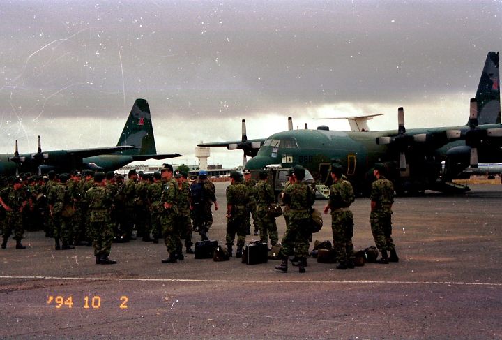 ■ナイロビ空港で出発準備中の陸上自衛隊のルワンダ難民救援隊第1陣と航空自衛隊のC-130H輸送機。