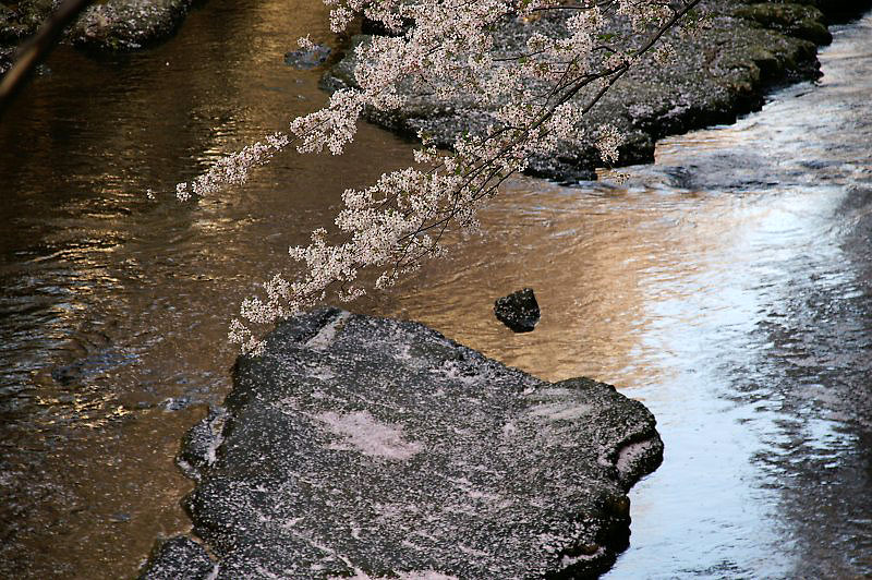 花びらが散り敷いた川底の岩盤に桜の枝が。