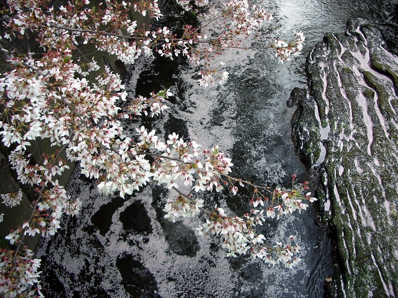 曙橋。花びらが際立たせる川底の独特の模様。