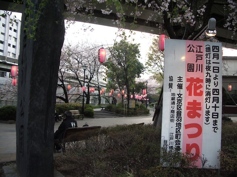 江戸川橋たもとの江戸川公園入り口。早めの満開宣言だったがなんとか持ちこたえている。