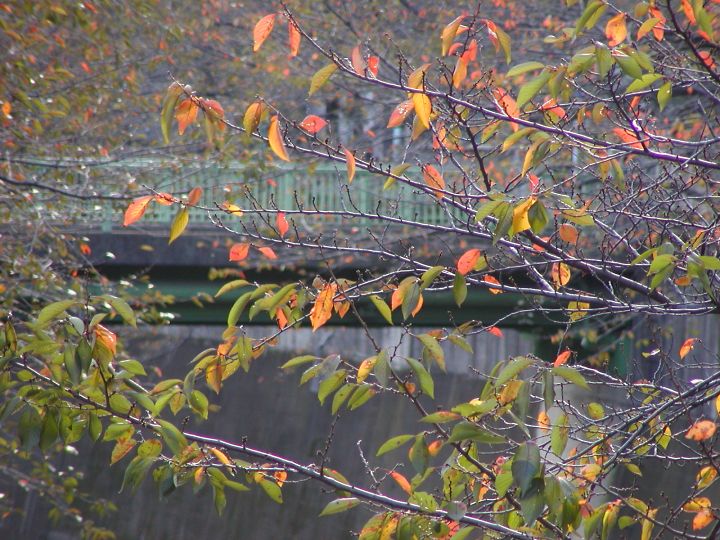 ■曙橋から下流側の桜の葉。向こうに見える橋は面影橋です。