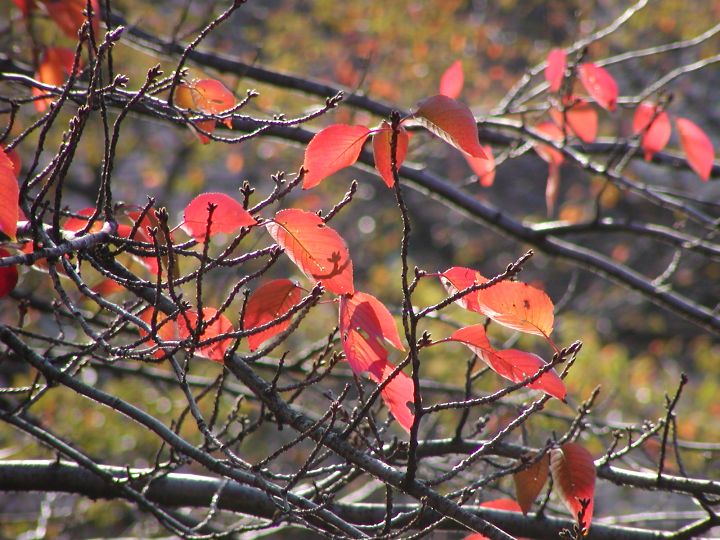 ■駒塚橋の左岸下流の桜の紅葉。逆光で太陽光を透かして見ています。来春の新芽の準備がされているようです。