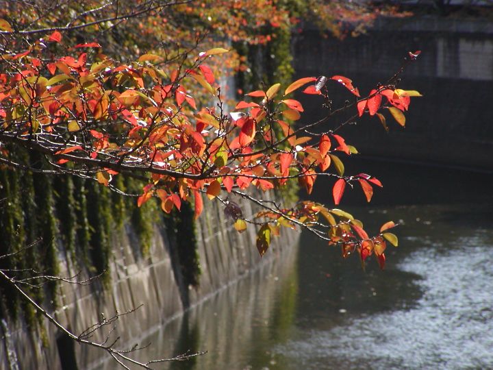 ■駒塚橋の左岸下流の桜の紅葉。神田川の直立護岸にアイビー種のグランドカバープランツが垂下しています。