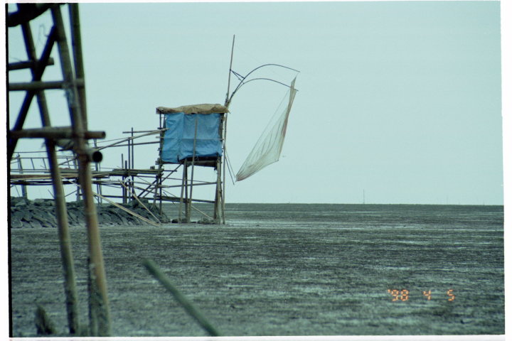 のっぺりして平らな潟に向かって四つ手の網を下ろします。