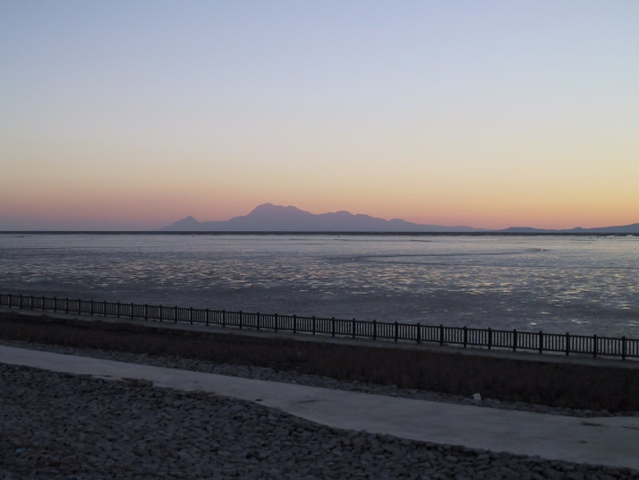 夕闇に入ろうとする雲仙普賢岳と干潟です。