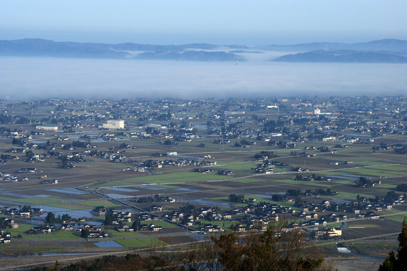 富山県 砺波平野の散居村 「クロスランドおやべ」というタワーが朝霧の上に浮かんでいる 2009/4/18撮影