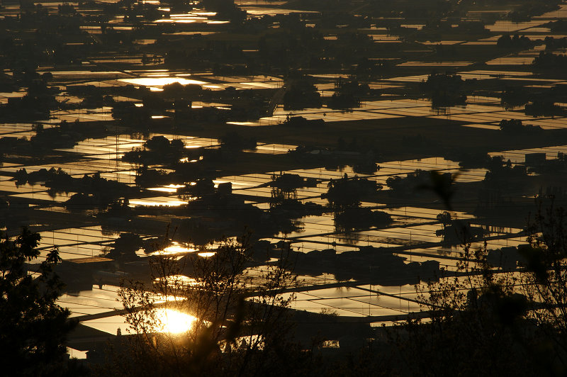 富山県 代かきが進んだ砺波平野の散居村 傾いた陽が水面に反射する 2009/5/1 撮影