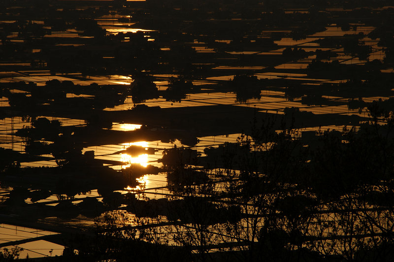 富山県 代かきが進んだ砺波平野の散居村 傾いた陽が水面に反射する 2009/5/1 撮影