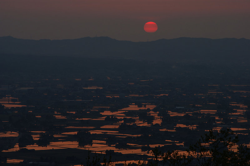 富山県 代かきが進んだ砺波平野の散居村 真っ赤な夕日 2009/5/1 撮影