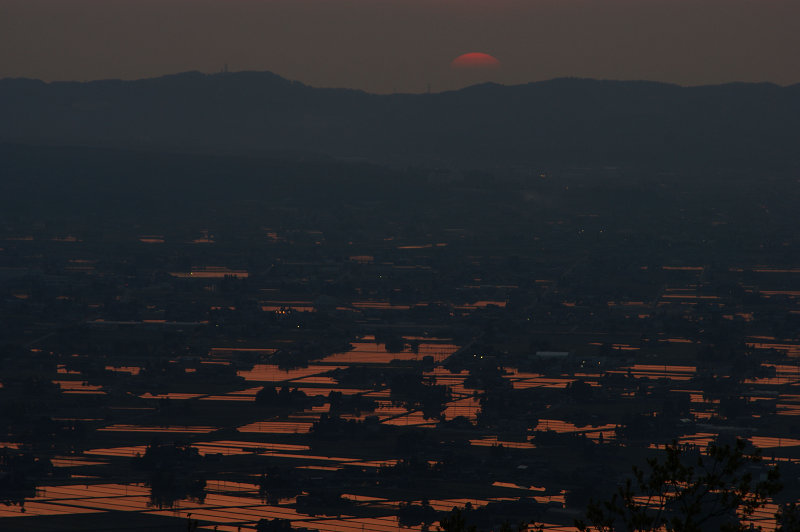 富山県 代かきが進んだ砺波平野の散居村 消え行く夕日 2009/5/1 撮影