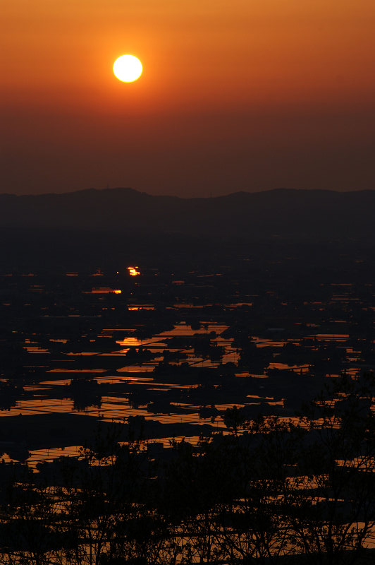 富山県 代かきが進んだ砺波平野の散居村 傾いた陽で空が赤らんできた 2009/5/1 撮影