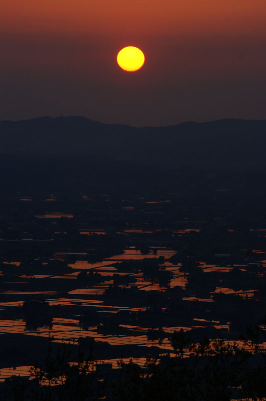富山県 代かきが進んだ砺波平野の散居村 赤い夕日 2009/5/1 撮影