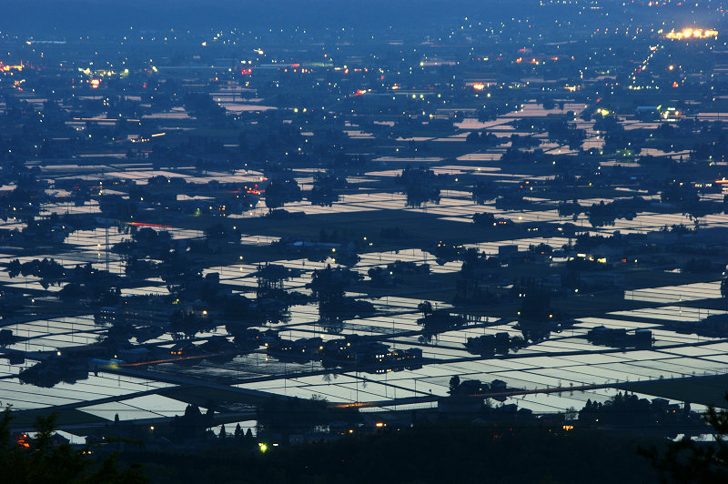 富山県 代かきが進んだ砺波平野の散居村 日没後30分、明かりが灯る 2009/5/1 撮影