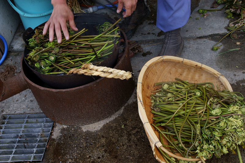 鉄鍋で湯がき、わら縄で持ち上げていた
