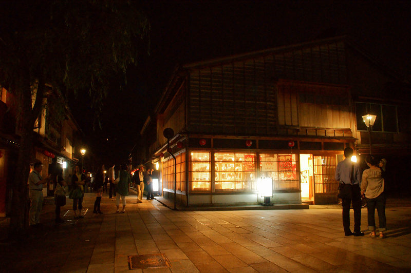 夜は紅殻格子を透かして土産物屋の中が見えている。