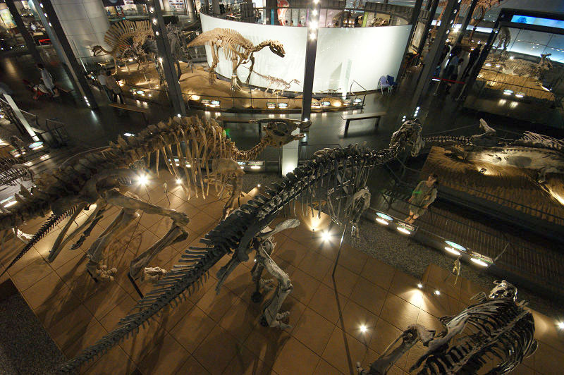 2階から1階を眺める。大型の鳥脚類を見上げて立ちすくんでいるような子がいた。