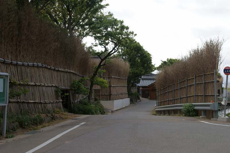 「間垣」とは日本海から吹き付けてくる冬の季節風の害を防ぐために設置された防風垣。5mくらいの長さのニガ竹を縦に隙間なく建ててある。間垣は能登半島の外浦方面で見られるが、大沢町と上大沢町ではまとまった姿で見られるので「間垣の里」と呼ばれているらしい。