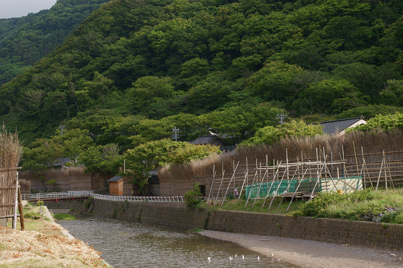 「間垣」とは日本海から吹き付けてくる冬の季節風の害を防ぐために設置された防風垣。5mくらいの長さのニガ竹を縦に隙間なく建ててある。間垣は能登半島の外浦方面で見られるが、大沢町と上大沢町ではまとまった姿で見られるので「間垣の里」と呼ばれているらしい。