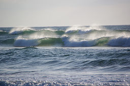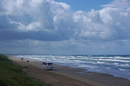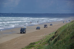 ■千里浜なぎさドライブウェイは、観光バスでも、そのまま海岸の砂浜を8kmにわたって走ることができる。
