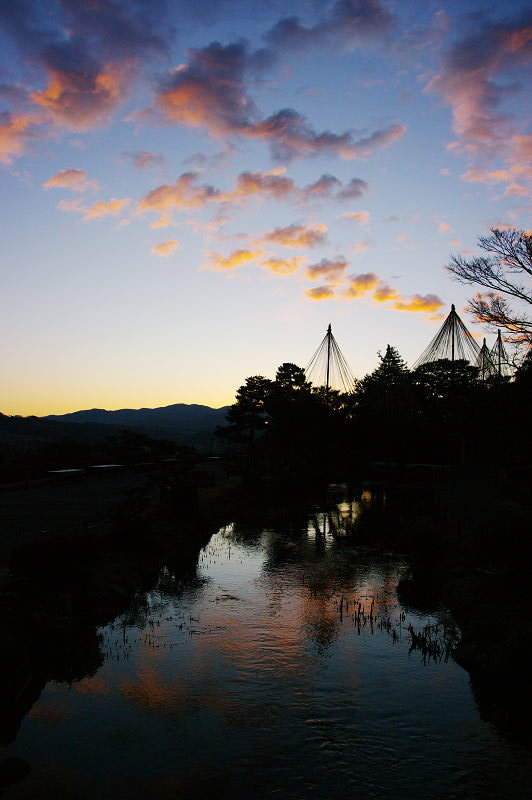 シルエットに沈む園地で、あかね雲を映す曲水が色づいていた。