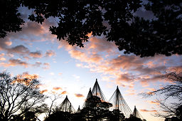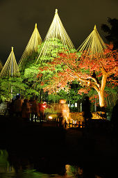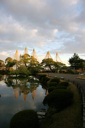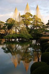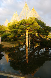 | ■兼六園の名は、「宏大(こうだい)、幽邃(ゆうすい)、人力(じんりょく)、蒼古(そうこ)、水泉(すいせん)、眺望(ちょうぼう)」の六勝を兼備するという意味。 ■この六つの趣を全て備えた庭園を創ることは難しいとされてきた。 ■雪吊りは樹木を雪の重さから守る術の一つだが、元々はリンゴの実の重さから枝を守るために考案された「りんご吊り」の手法が兼六園の代表松樹「唐崎松」に施されている。金沢と青森との繋がりを見つけたようで嬉しい。 |