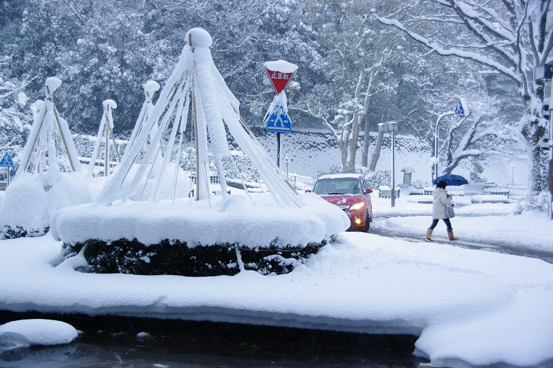金沢城丸の内前の交差点。朝8時。雪吊りが一晩30数センチの雪を支えている。
