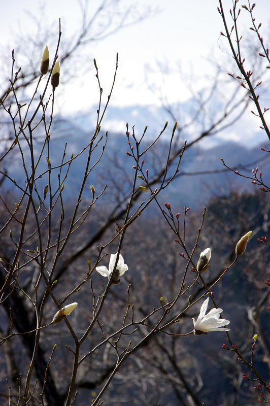 加賀の里山で、尾根筋に咲くタムシバの向こうに白山が望める。