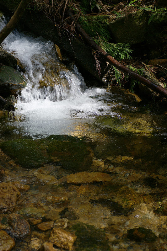 針葉樹林の中の渓流に陽が射し込んでいた。