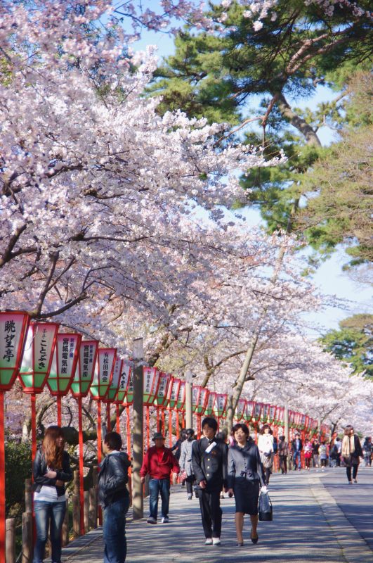 蓮池門通りには、花見のぼんぼりが並ぶ。