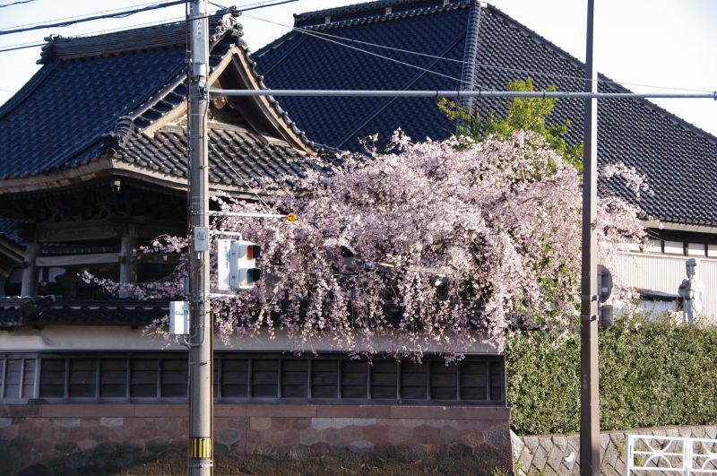 寺の塀から溢れる桜。